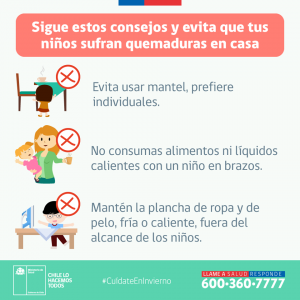 La Subsecretaria de Salud Pública, del MINSAL, doctora Paula Daza hace una llamado a la ciudadanía porque: “Las bajas temperaturas ambientales favorecen el uso de sistemas de calefacción dentro del hogar; al mismo tiempo los niños permanecen más tiempo dentro de sus casas por el frío lo que los expone también con mayor frecuencia al contacto con objetos calientes como al volcamiento de líquidos hirviendo”.