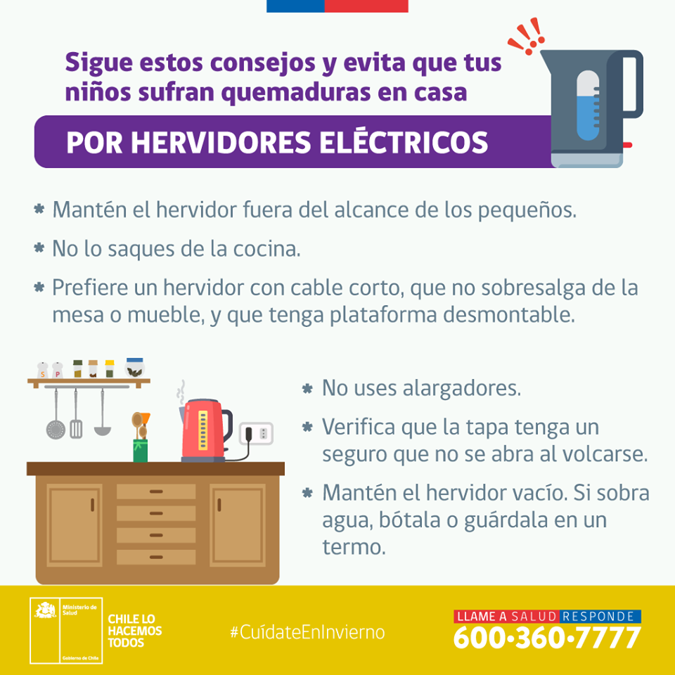 La Subsecretaria de Salud Pública, del MINSAL, doctora Paula Daza hace una llamado a la ciudadanía porque: “Las bajas temperaturas ambientales favorecen el uso de sistemas de calefacción dentro del hogar; al mismo tiempo los niños permanecen más tiempo dentro de sus casas por el frío lo que los expone también con mayor frecuencia al contacto con objetos calientes como al volcamiento de líquidos hirviendo”.